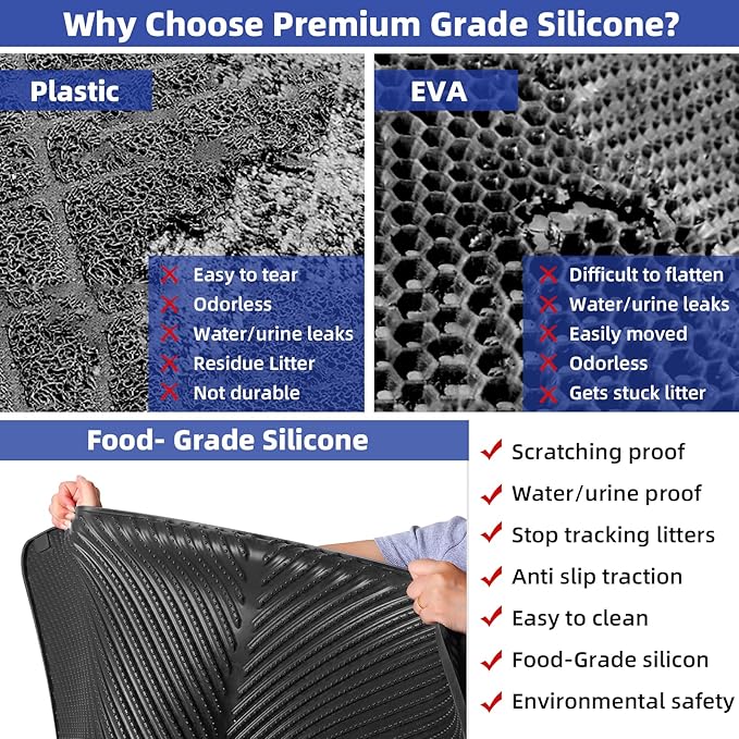 - Silicone Litter Mat: The cat mat is made of high quality food grade silicone material, non-toxic, odourless, safe, BPA free and durable. Soft texture for cats to walk on and release litter.