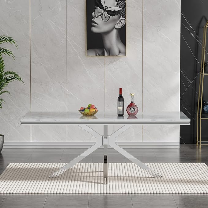 • Elegant Faux Marble Table Set for 6 People : The rectangular dining table boasts a sleek 70-inch faux marble MDF tabletop, ensuring durability and easy maintenance. Paired with sturdy and stable X-shape Mirrored Stainless Steel Base, this dining table set offers both style and reliability for everyday use.