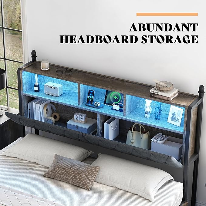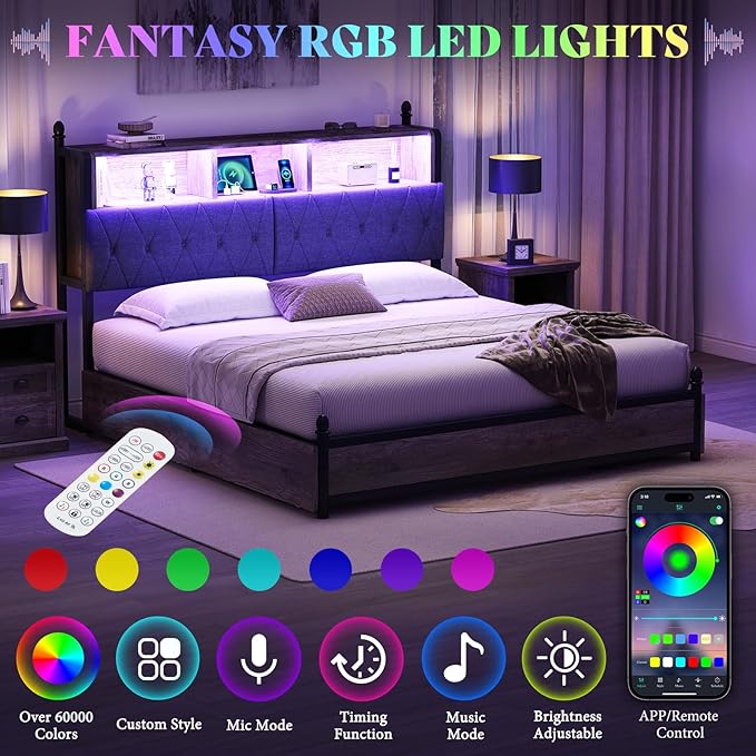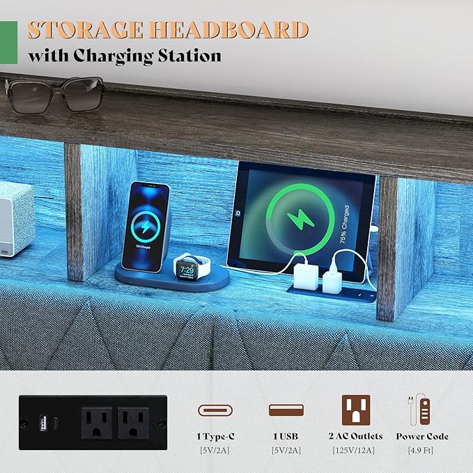 - INCLUDED CHARGING STATION & LED LIGHTS: The bedframe cleverly integrates 2 AC outlets & 1 USB port and 1 Type-C port to meet your electronic device charging needs. Multi-color RGB LED lights create a personalized atmosphere.