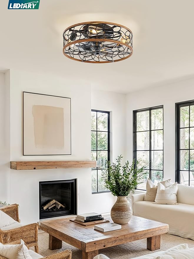 LEDIARY Caged Ceiling Fans with Lights, Farmhouse Flush Mount Ceiling Fan with Remote, Black&Walnut Low Profile Ceiling Fan Light Fixture for Bedroom, Kitchen, Dining Room.