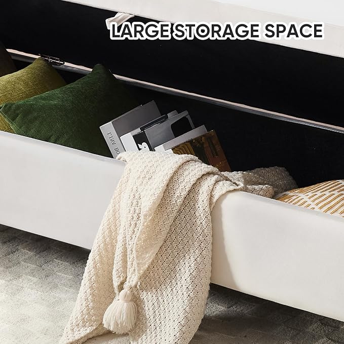 - Large Storage Space - 65 inches storage ottoman bench offers an ample internal space of 55.12" W x 17.72" D x 8.27" H, making it suitable for all bed sizes, particularly FULL and QUEEN sizes. This concealed storage area is perfect for seasonal blankets, toys, pillows, cushions, and more. Additionally, extra pockets on the side of the armrest provide convenient storage for books and magazines—helping you organize your room efficiently.