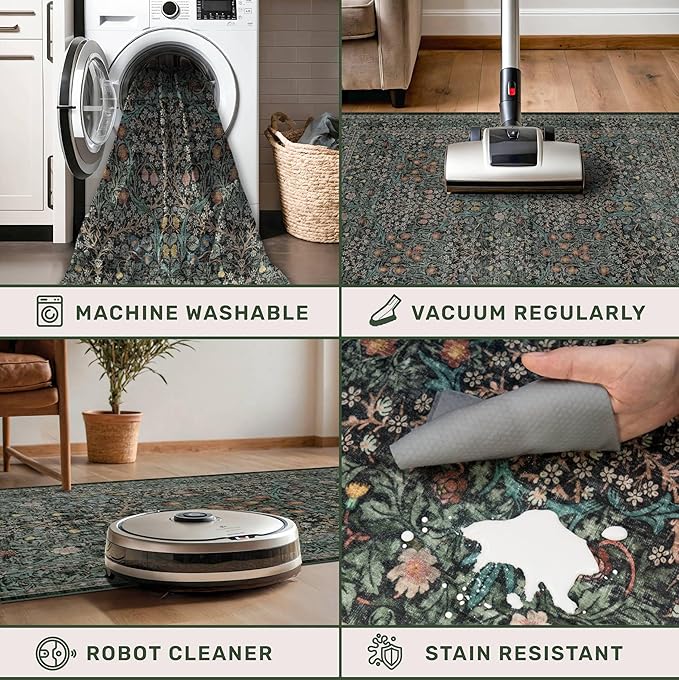 - Vintage Botanical Elegance: Echoing the refined artistry of 19th-century textile traditions, this floor rug showcases a classic botanical design that elevates any space. A rich palette of black, deep emerald, and moss tones flows through intricate floral and oriental motifs, creating a dramatic focal point. Inspired by Victorian aesthetics, the contrast of vivid greens, vibrant reds, and delicate vines adds depth and sophistication, infusing your home with timeless vintage charm
