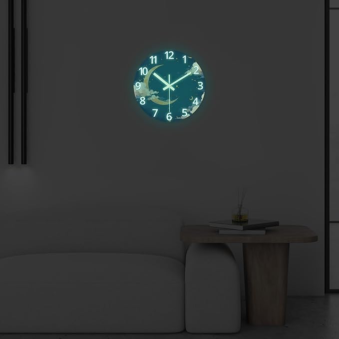 - 2.[PERFECT DECORATION]:The glow in the dark clock is a beautiful accent for your bedroom when the lights go out. It adds a natural nighttime ambiance to the room and allows you to relax and fall asleep faster. If this clock absorbs enough sunlight during the day, it will glow at night. The glow time depends on the amount of light absorbed during the day. The more light it absorbs, the stronger and longer the night light will last. The glow in the dark wall clock is perfect for hanging in the bedroom living room of young children.