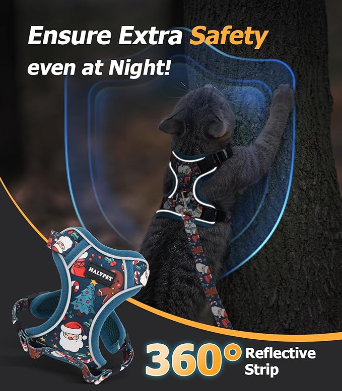 - [Ergonomic Design Cat Harness] Enjoy the well-built cat harness designed by Halypet! Our particular streamlined + 5 Pull dispersion points + D-ring cat harness design allows the tension from the cat leash to be evenly distributed across cats’ shoulders and chests, preventing cats from choking or neck strain, The reflective strips enhance visibility during evening walks. Safer compared to many traditional cat collars and cat harnesses on the market!