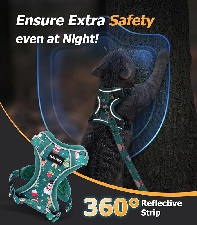 - [Ergonomic Design Cat Harness] Enjoy the well-built cat harness designed by Halypet! Our particular streamlined + 5 Pull dispersion points + D-ring cat harness design allows the tension from the cat leash to be evenly distributed across cats’ shoulders and chests, preventing cats from choking or neck strain, The reflective strips enhance visibility during evening walks. Safer compared to many traditional cat collars and cat harnesses on the market!