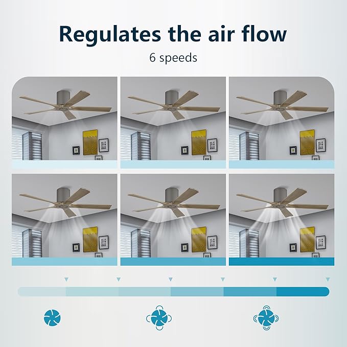 - Ceiling Fan with Remote Control: The indoor ceiling fan without light, 6-speed adjustment via included remote, and (1/2/4/8h) timing settings. The simple buttons of the remote control can still be used worry-free, even by the elderly and children. You are guaranteed a perfect experience