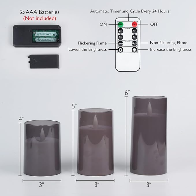 - Package Includes: This battery candle set includes 3 flameless candles (height 4"5"6", diameter 3"), 1 remote control, 1 user manual. Each candle is powered by 2 AA batteries (not included, 500+ hours with premium batteries) and the remote control is powered by two AAA batteries (not included). All of these electric candles are rigorously tested by Homemory.