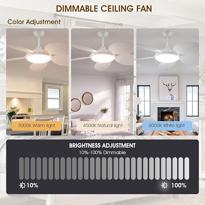 - 36W LED Lighting: Equipped with a 12.6-inch modern LED light, this ceiling fan offers 36W of high-quality lighting. The brightness and color temperature are adjustable to suit various lighting needs, enhancing your space with warmth and brightness.