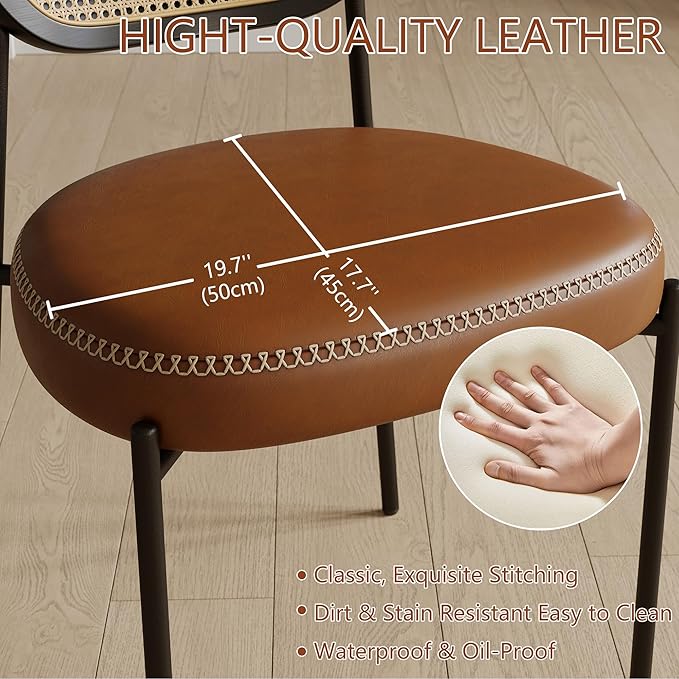 Rattan Dining Chairs Set of 4, Camel Leather Upholstered Dining Chairs with Rattan Cane Back, Mid Century Modern Dining Room Chairs with Black Metal Legs & D-Shaped Thicken Cushion, Camel