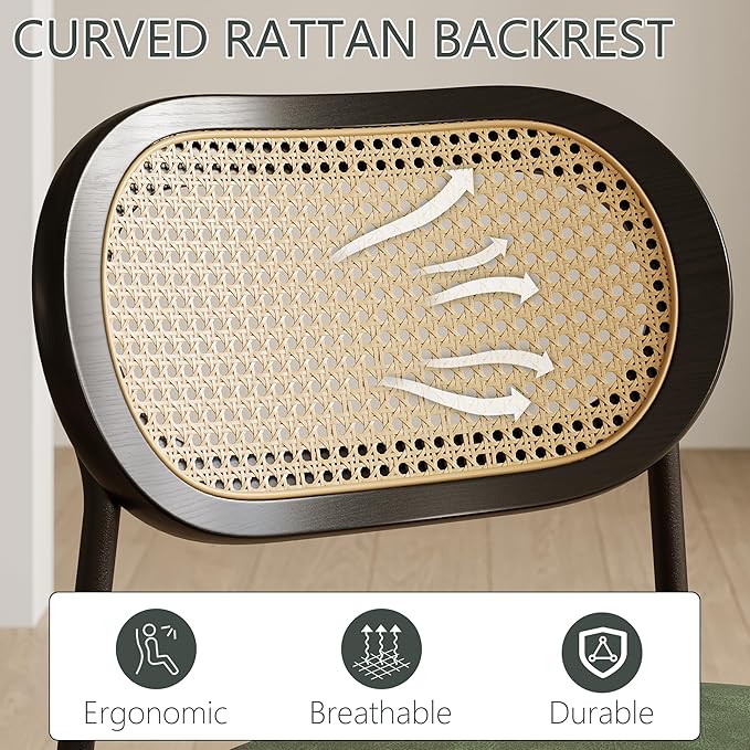 - š·[MID-CENTURY MODERN STYLE]: This rattan back dining chair set incorporates a mid-century modern aesthetic with an elegant curved backrest making it a bright addition to your dining room decor. It is not only a comfortable dining chair, but also an ideal choice for decorating your kitchen and dining room. both classic and modern look is suitable for many occasions, such as dining room, kitchen, bedroom, balcony, courtyard, waiting room, vanity table, canteen, and cafes etc.