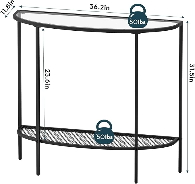 SAYGOER Glass Half Moon Console Table 2 Tier Narrow Entryway Table with Black Metal Frames, Modern Couch Table Small Entry Way Tables, Easy Assembly, Clear Glass