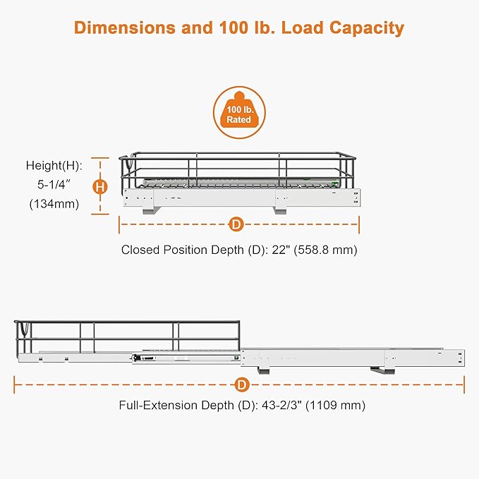 - Smooth and Sturdy Sliding System - Equipped with heavy-duty, soft-close ball-bearing slides, this cabinet pull out shelves ensure quiet and effortless operation. Built to support up to 100 lbs, it’s perfect for storing heavy cookware, mixer, and kitchen essentials