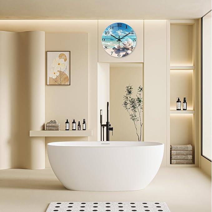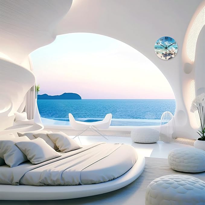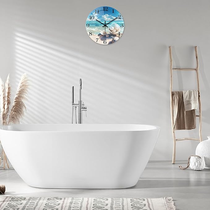 - 1.[Size] - The ocean wall clock is 12 inches x 12 inches, HD glass wall clock,frameless analog wall clock,round wall clock for bedroom,small wall clocks for living room,beach wall clock for bathroom,coastal wall clock for office.