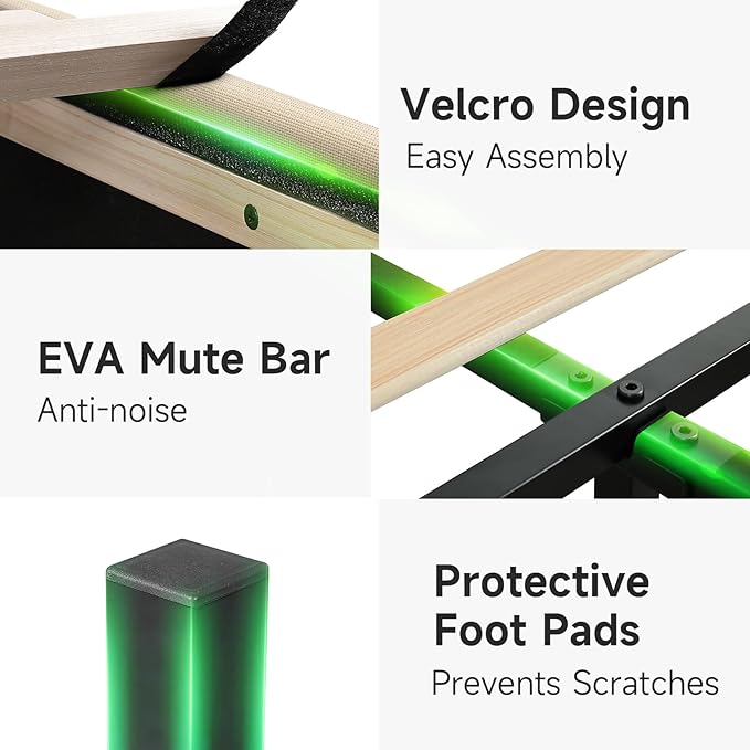 - 【Solid and noiseless 】The bed frame consists of a heavy metal frame and 12 solid wood slats, A pull bar in the middle of the headboard makes the bed frame more stable, Eight support points can support up to 1,000 pounds, effectively extending the life of the bed frame. Solid wood slats with Velcro and EVA mute bar, effectively avoid the noise caused by the friction between wood and metal frame, will not squeak, ensure your sleep quality!