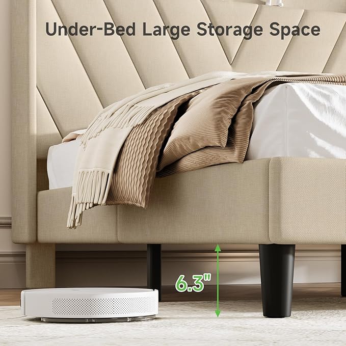 - 【Multi-functional storage space】Leave enough space at the top of the headboard to easily place small items such as mobile phones, alarm clocks, books, and decorations. The 6.3-inch height space under the bed allows for the storage of more household items, easily storage of luggage, shoeboxes and storage boxes, and the sweeping robot can easily pass through to keep the bedroom clean and tidy. This is a popular style for families with limited space!