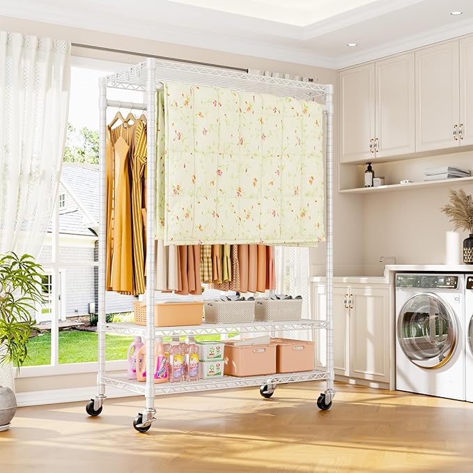 - Flexible Movement & Secure Locking: The rolling clothing rack features four 360° swiveling rubber wheels (2 with lockable brakes) for smooth movement across any floor. It provides easy access to bedrooms, cloakrooms, laundry rooms, walk-in closets, and more. Locking two wheels keeps the rack secure