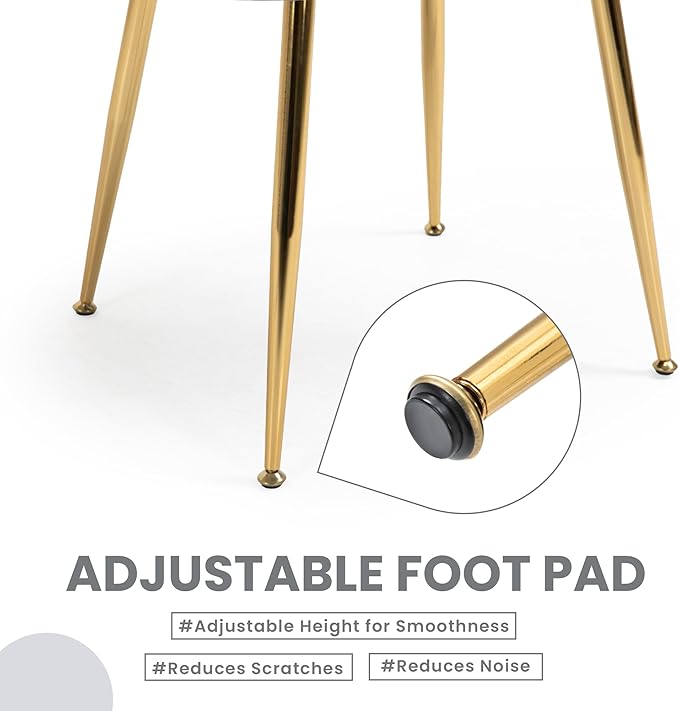 - 【Sturdy & Stable Structure】The velvet kitchen chairs with gold painted metal legs add a touch of elegance to your living area. Durable high-quality structure metal plated legs can provide a load-bearing capacity of up to 300lbs, lightweight but sturdy. Meanwhile, each metal tapered leg is equipped with adjustable foot pads, which can maintain balance on uneven surfaces, carpets, or hard floors, and protect the floor from scratches.