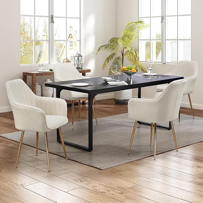 ECOTOUGE Teddy Velvet Dining Chairs Set of 4, Modern Arm Chair with Golden Metal Legs, Fluffy Boucle Sherpa Accent Chairs for Kitchen, Cream White
