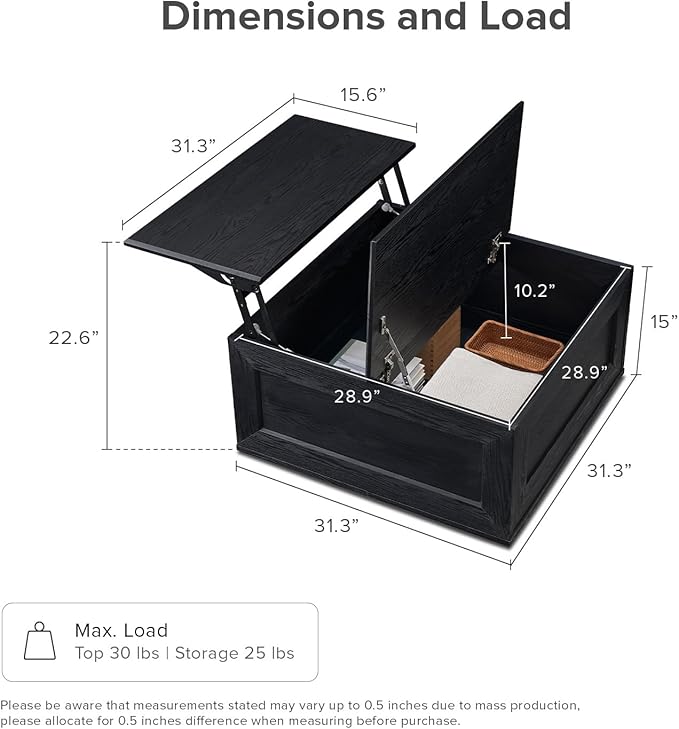 - Dimensions: 31.3 (W) x 31.3 (D) x 15 [closed], 22.6 [lift-top extended] (H) inches; 1-year warranty
