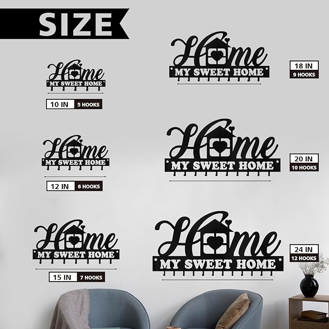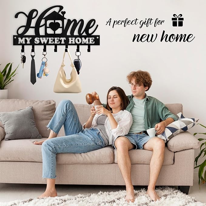 Personalized Sweet Home Key Holder - Black Metal Key Hanger Wall Decorative, Organizer with Hooks, Housewarming Gifts