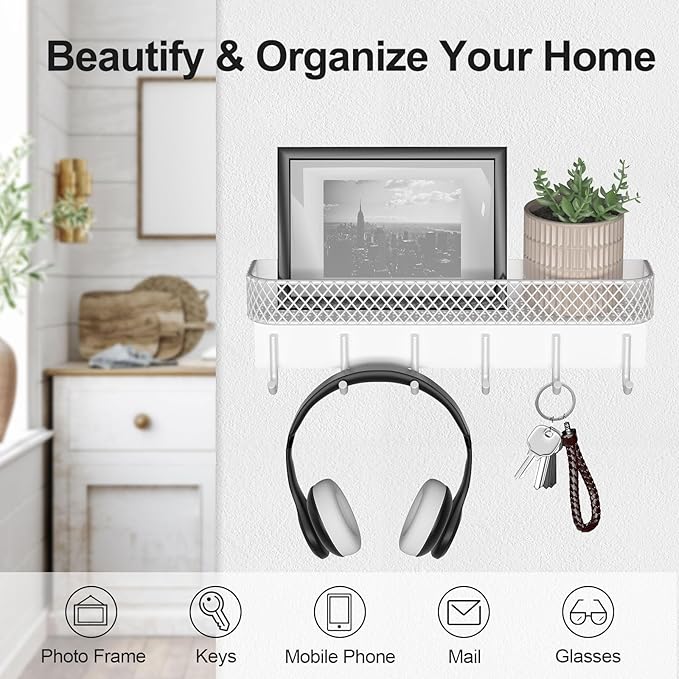 - MAIL HOLDER AND KEY RACK organizes any room instantly. Keep keyrings, sunglasses and other items organized and within reach of the front door, work desk, stove or shower with 6 sturdy key hooks.