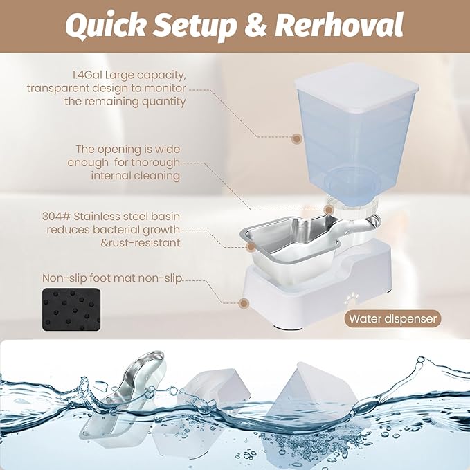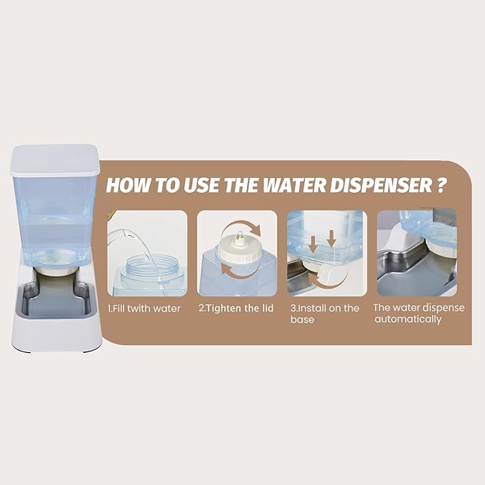 - 【Enthusiastic eaters-Friendly】---Engineered with a dual-angle anti-tip base, It maintains its stability with ease, withstanding accidental bumps from dogs. And textured silicone pads prevent slippery disasters.The water bottle is tightly integrated with the base, and the deepened water bowl prevents water from overflowing, providing your pet with a better drinking and food feeding experience.
