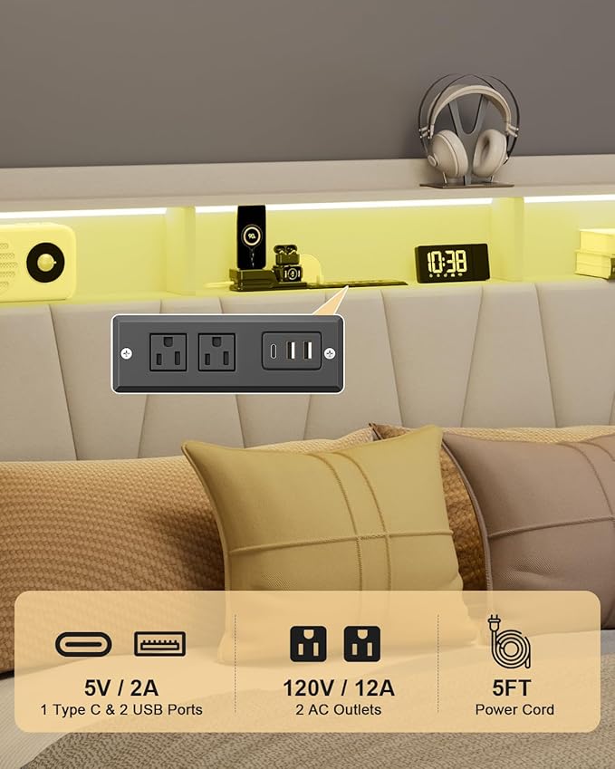 - 【Full Bed Frame with Headboard】① Full size bed includes a built-in charging station with 2 AC outlets, 2 USB port, 1 Type-C port; ② Full bed frame with headboard shelf for daily essentials such as books, phones, cameras, etc