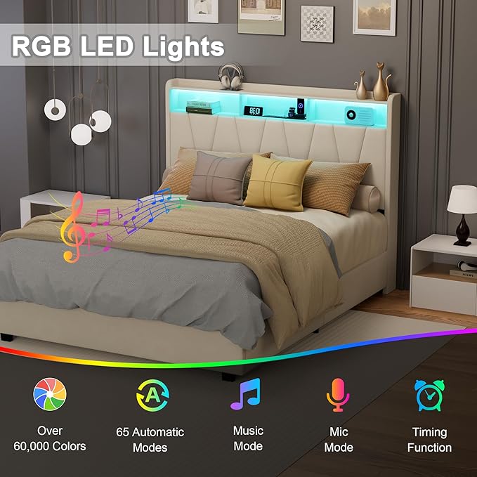 - 【Modern and Elegant】Full size bed frame with a modern design and plush velvet, featuring a headboard with storage and colorful LED lighting, adding a touch of elegance and style to any bedroom.(The velvet shifts in color depending on the angle and lighting, appearing darker in shadows and lighter in bright light.)