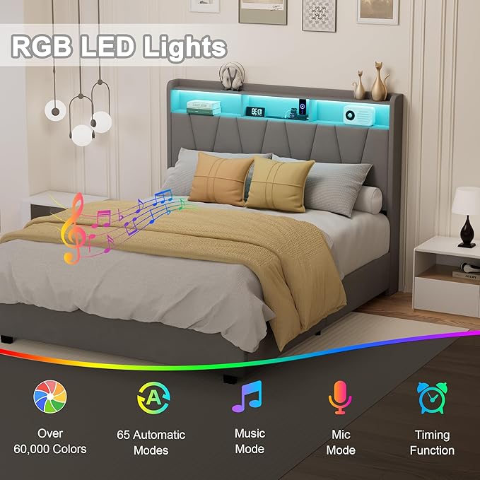 - 【Modern and Elegant】Full size bed frame with a modern design and plush velvet, featuring a headboard with storage and colorful LED lighting, adding a touch of elegance and style to any bedroom.(The velvet shifts in color depending on the angle and lighting, appearing darker in shadows and lighter in bright light.)
