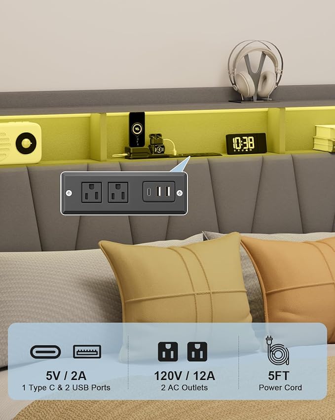 - 【Full Bed Frame with Headboard】① Full size bed includes a built-in charging station with 2 AC outlets, 2 USB port, 1 Type-C port; ② Full bed frame with headboard shelf for daily essentials such as books, phones, cameras, etc