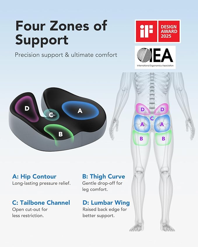 - Four-Zone Ergonomic Comfort: Featuring four distinct support zones—hip contour, thigh curve, open tailbone channel, and lumbar support wings—this chair cushion is shaped to fit your body's natural form. The ergonomic design evenly distributes pressure, helping to reduce fatigue, numbness, stiffness, and pain. This seat cushion for office chairs is a must-have for long periods of sitting, whether you’re using it on your office chair or in your car. Say goodbye to chronic discomfort with this pressure relief seat cushion.