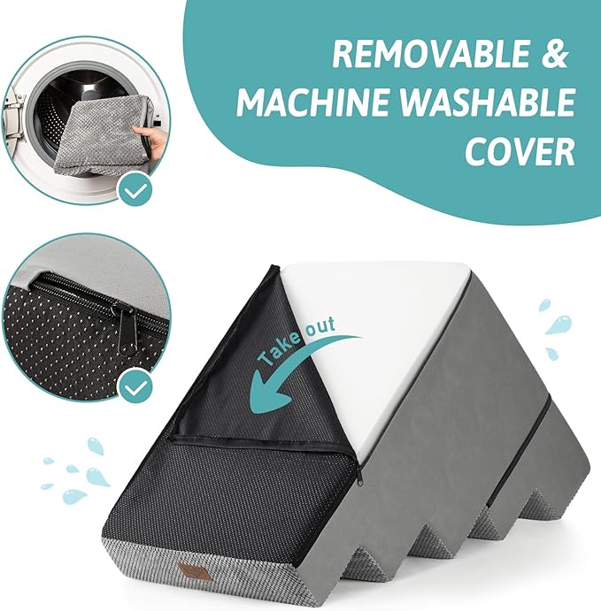 - Non-Slip Base and Removable Cover: Our dog steps for beds are equipped with a non-slip base featuring rubber dots for extra grip, minimizing movement during use. The pet steps cover is waterproof on the inner side, so you donโt have to worry about stains seeping into the foam. The outer cover is removable and machine washable for easy cleaning