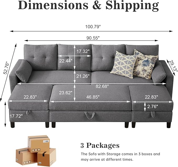 - 3 Packages -It's simple to assemble, disassemble this sectional couch. The sofa with storage comes with 3 boxes, which may be delivered at different times. If you have any questions about the tracking numbers or the product, please feel free to contact us. We will respond to you in 24 hours