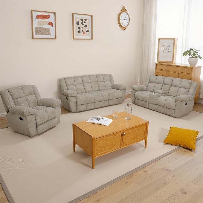 - 【Convenient Cup Holders】Corduroy recliner sofa set is equipped with hidden cup holders in the armrests,ensuring your beverages are always within easy reach.This feature is ideal for movie nights or long reading sessions,providing practicality without sacrificing style.