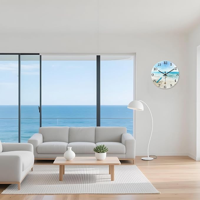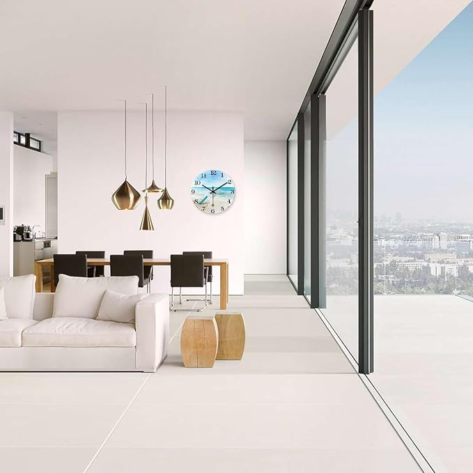 - 1.[Size] - Wall mount clock is 20 inches x 20 inches, HD glass wall clock,frameless analog wall clock,round wall clock for bedroom,decorative wall clocks for living room,beach wall clock for bathroom,coastal wall clock for office.