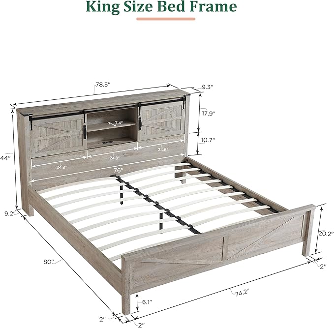 RedLemon Farmhouse King Size Bed Frame with Bookcase Headboard & Sliding Barn Door, Storage Shelves, Charging Station, Wood Slats Support, No Box Spring Needed, Light Rustic Oak
