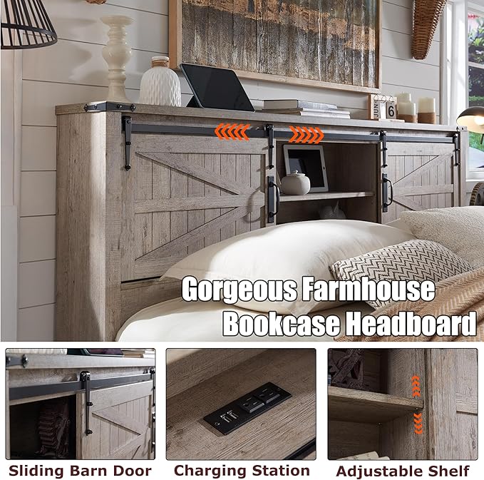- 44" Farmhouse Bookcase Headboard with Sliding Barn Door: RedLemon's designers have blended a classic farmhouse's beauty with headboard storage's practicality perfectly. Sliding barn doors add a chic touch to your bedroom while allowing you to hide clutter behind them and keep your room neat and organized.