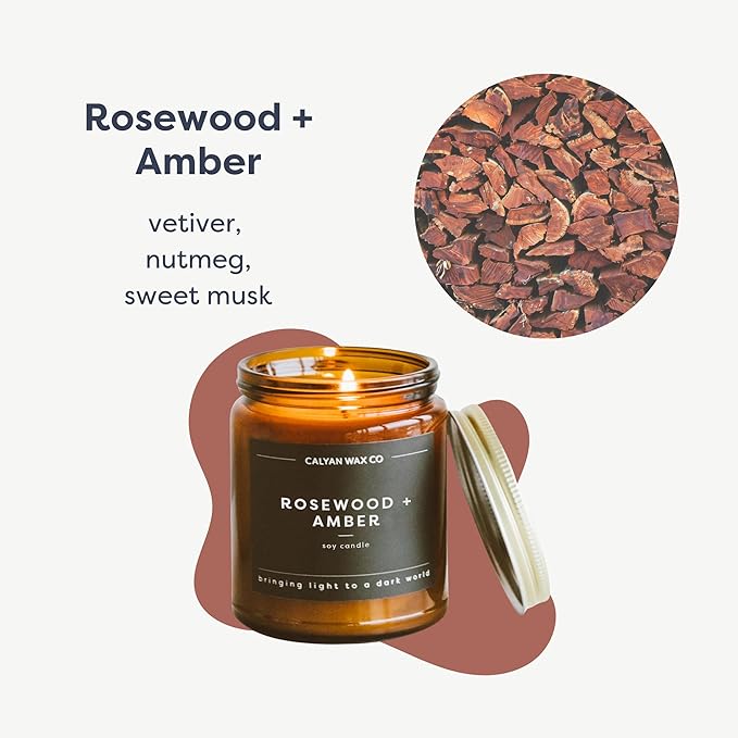 Calyan Wax Co. Rosewood & Amber Scented Candle - 57 Hour Burn - Luxury Non Toxic Soy Wax Candles - Long Lasting Amber Glass Jar Candle for Home - 7.2oz