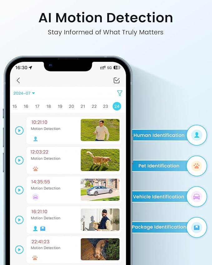 - ใ๐๐ง๐ญ๐๐ฅ๐ฅ๐ข๐ ๐๐ง๐ญ ๐๐จ๐ญ๐ข๐๐ข๐๐๐ญ๐ข๐จ๐ง๐ฌ, ๐๐ข๐ฌ๐ฌ ๐๐จ๐ญ๐ก๐ข๐ง๐ ใThis wifi smart camera is equipped with advanced PIR motion sensor and has a powerful human shape database, can accurately distinguishes people from other objects. Once motion is detected, you will get instant notifications on ieGeek Cam, then you can hear and speak to visitors or activate siren and bright spotlights to deter intruders. It also supports AI analysis(paid feature), which can discern people, pets, vehicles and packages.