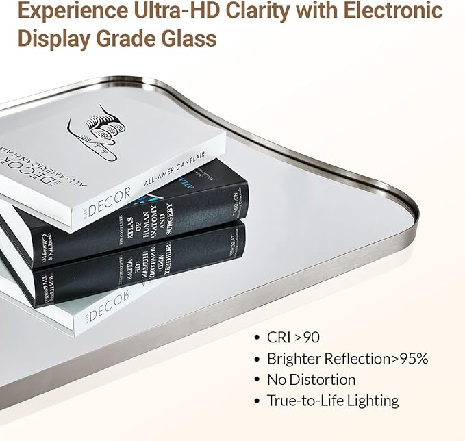 - 【Rust-Proof Stainless Steel Frame】: (N.W:24.5LBS). Crafted from stainless steel metal with oxidation-resistant properties, this 24x32 inch wall mirror offers enhanced stability and a longer lifespan. Shatterproof 4mm HD glass is supported by a 9mm MDF backboard (most others just 3mm ), surrounded by a 1/17" gap with the unique curved corner design to give a seamless finish