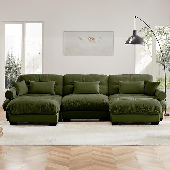 130"Oversized Couch, 3 Seater Modular Sectional Sofa, Olive Green Large U Shaped Sectional Couches for Living Room, Fluffy Couch Set, 3 Seater, Velvet Cloud Couches with Ottoman, Sofas for Living Room