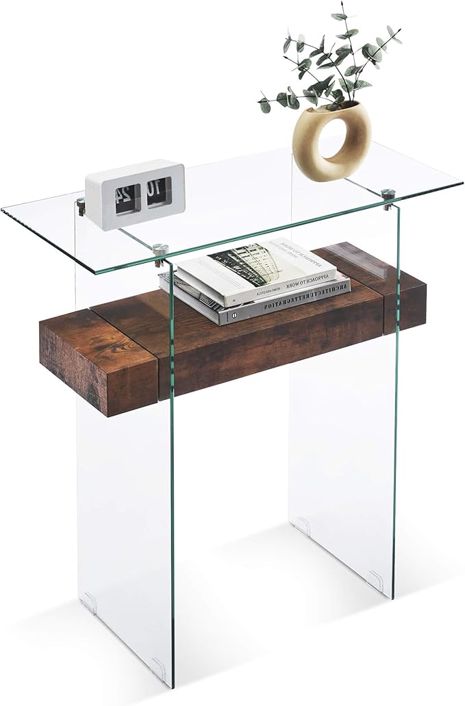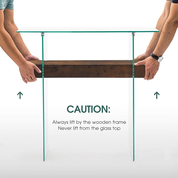 - Modern Glass Console Table: 8mm thick clear tempered glass tabletop with a smooth, beveled edge provides a perfect platform for framed photos or a stylish pair of lamps. Meanwhile, the two-tempered glass leg below gives your home an on-trend look. The console table can hold a weight capacity of 100 LBS