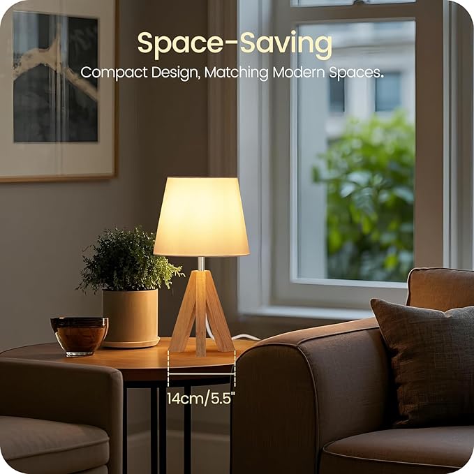 Small Tripod Table Lamp, Modern Nightstand Lamp with Fabric Shade, Boho Bedside Wood Desk Light for Bedroom, Kids Room, Living Room, Office, Study, White, W51TL05
