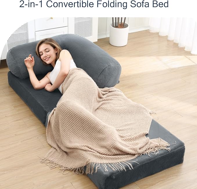 COMAX Folding Sofa Bed Single, Fold Out Chair Bed, Foldable Sofa Chair, Convertible Sleeper Futon for Adults, Floor Couch Mattress for Small Spaces Bedroom Living Room Guest Room, Faux Fur Dark Grey