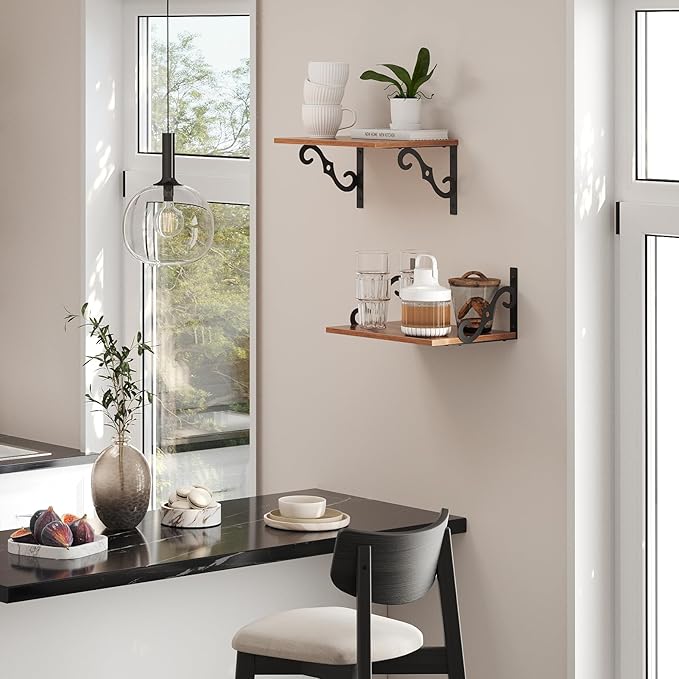 - 【Add Finishing Touch to Space】Boasting a retro-chic design, this wall mounted shelf effortlessly integrates with any decor style. Rusticity wood grain and exquisite S-shaped iron brackets flaunt visual interest and romance. It serves as both a practical storage solution and a stylish focal point