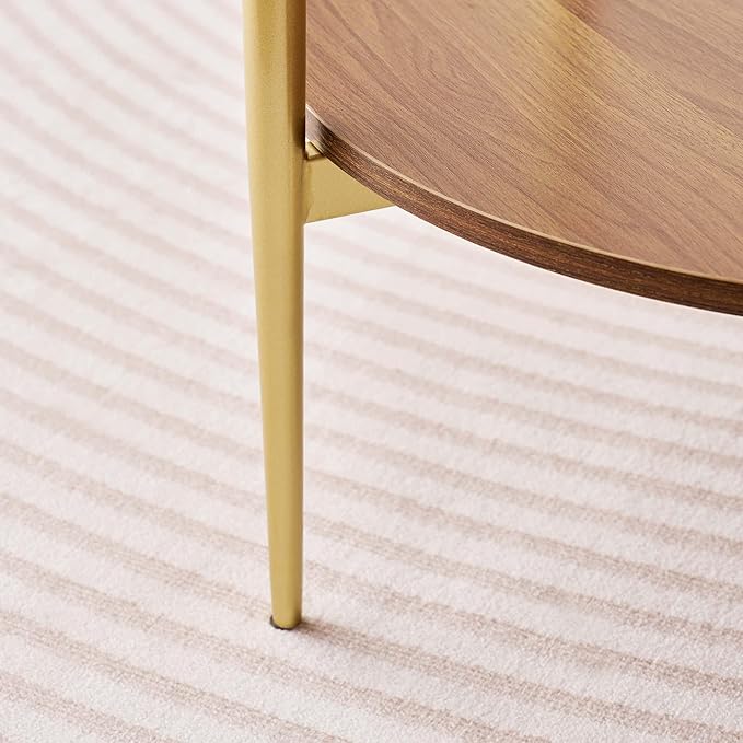 Round Glass End Table, Mid-Century Modern Design Sofa Table for Living Room, D18 x H23, 2-Tier Structure, Clear Glass Top and Walnut Shelf, Sleek Conical Legs with Gold Finish Frame