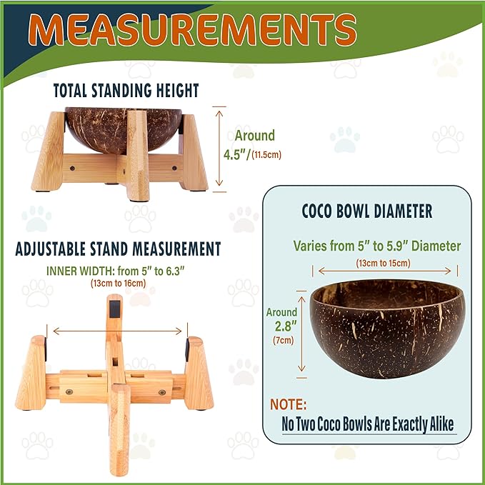 - Dimensions (H:5"xW:5") - Standing at 5 inches high with stand installed. The coco shell bowl width is around 5.5-inch in diameter.