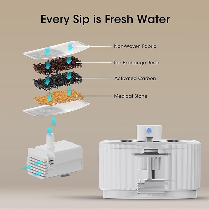 - Every Sip is Fresh Water: 1.Activated carbon removes bad taste and odor 2.Ion exchange resin could soften the tap water 3.Medical stone removes heavy metals and releases trace elements 4.Non-woven fabric could filter hair and impurities 5.The high-density sponge of pump helps remove fine particles. Purifying water quality, pets can drink water without worry