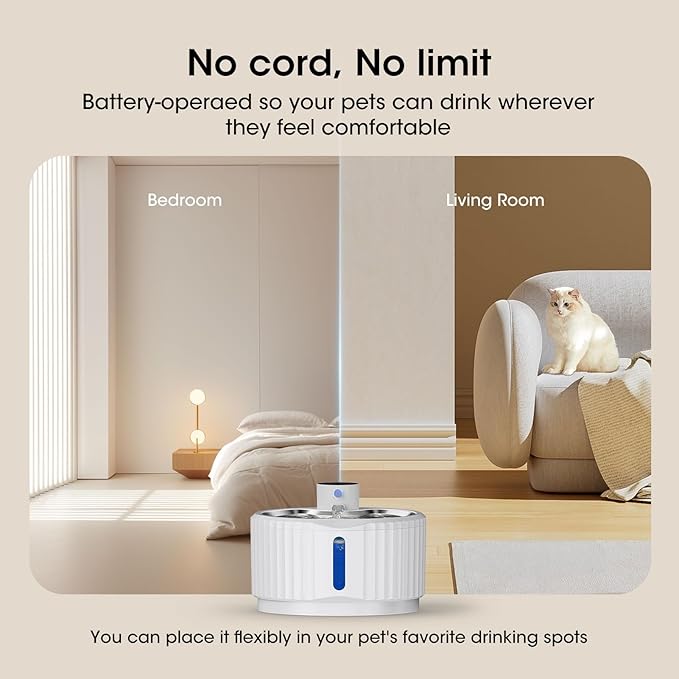 - Wireless Battery Operated Design: Say goodbye to tangled cords, allowing your pet to enjoy fresh, clean water anywhere. Effective preventing pets from biting on wires. You can place it flexibly in your pet's favorite drinking spots