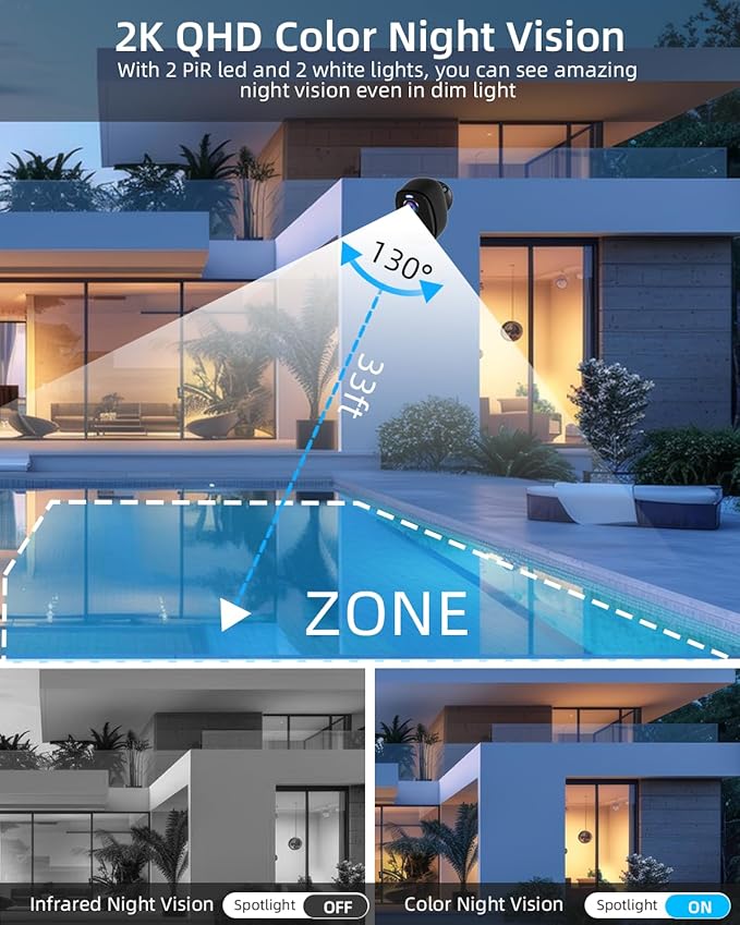 - 【2K QHD Live Video & Color Night Vision】The lens of the security camera adopts a 130° wide-angle design, which can be seen to obtain a wider field of view. With 3MP ultra-high definition, you can see clearer details than 1080P cameras. A stunning full color night vision security camera allows you to get a clear picture even in total darkness.